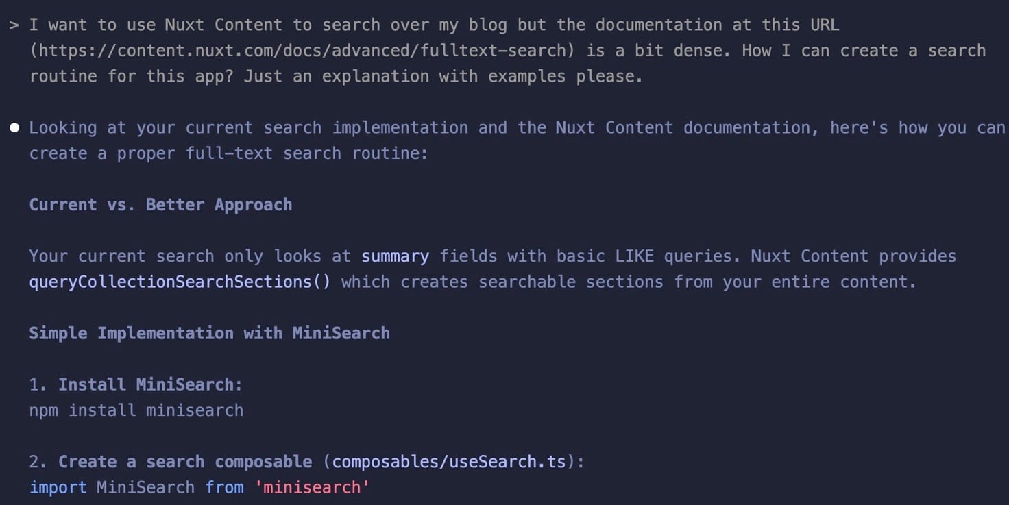 For instance: I use Nuxt Content on my other site, bigmachine.io, and the search feature does a fuzzy string match - that's it. I know there is a better way - so I can just ask Claude (using Claude Code):