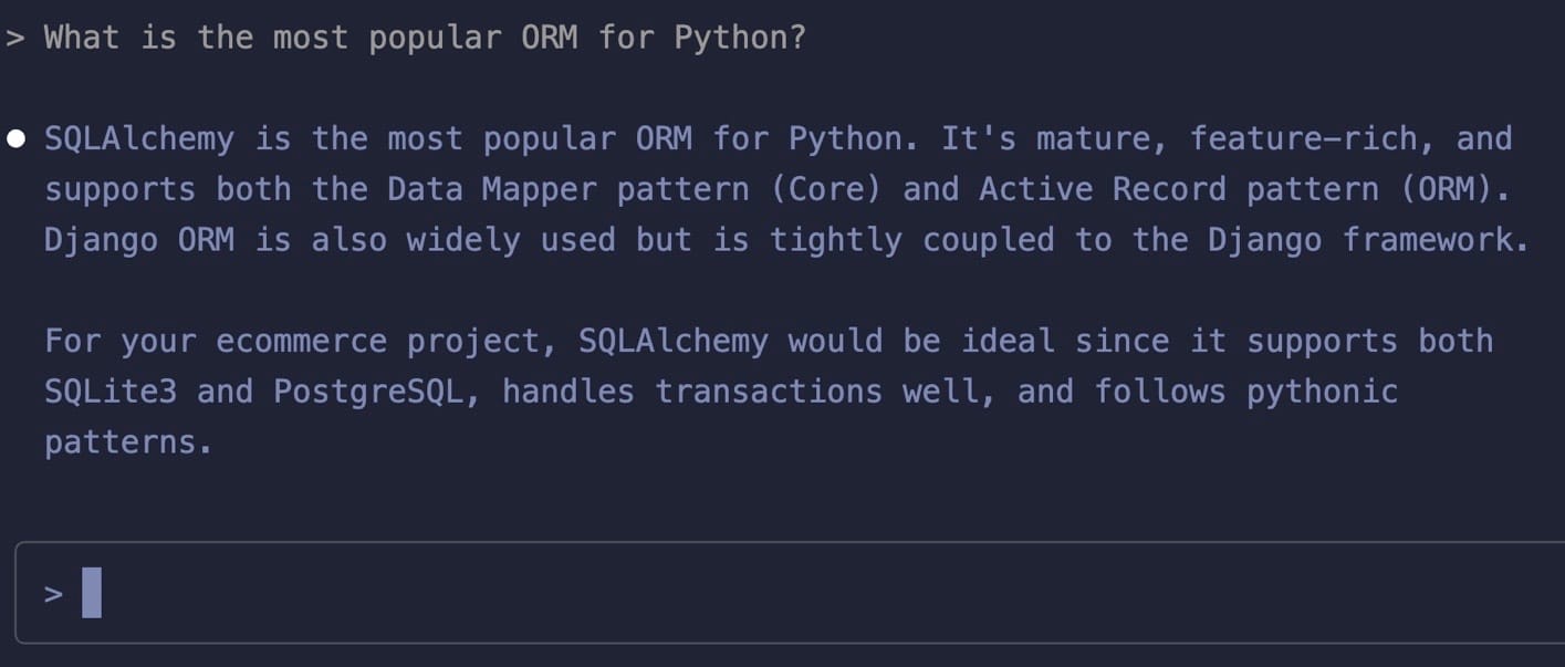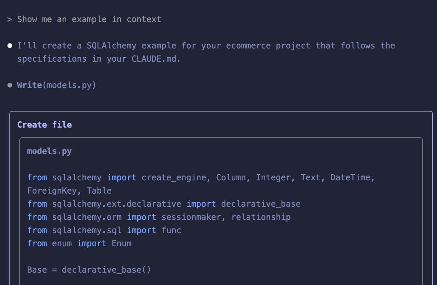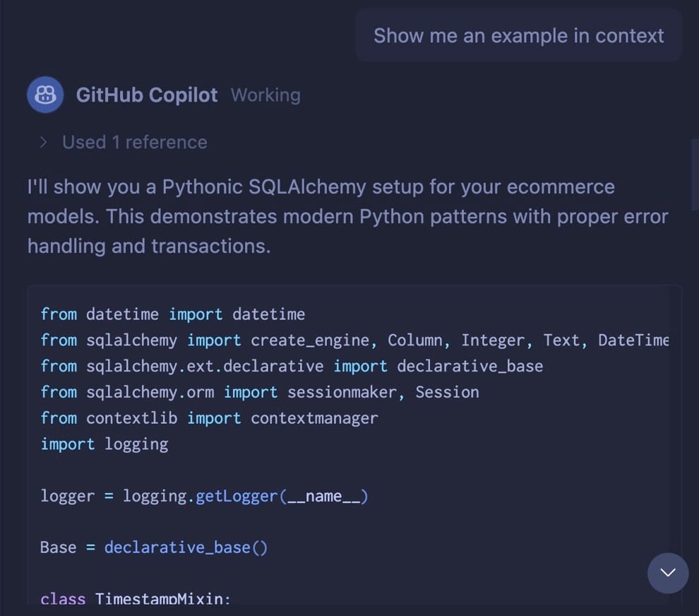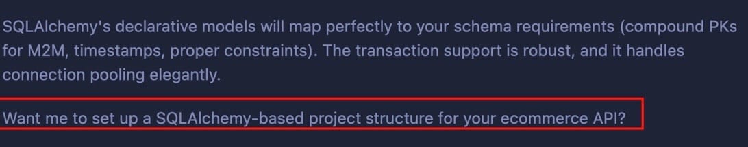 Want me to set up a SQLAlchemy-based project structure for your ecommerce API?I probably should have said no, and used my prompt "show me an example in context".