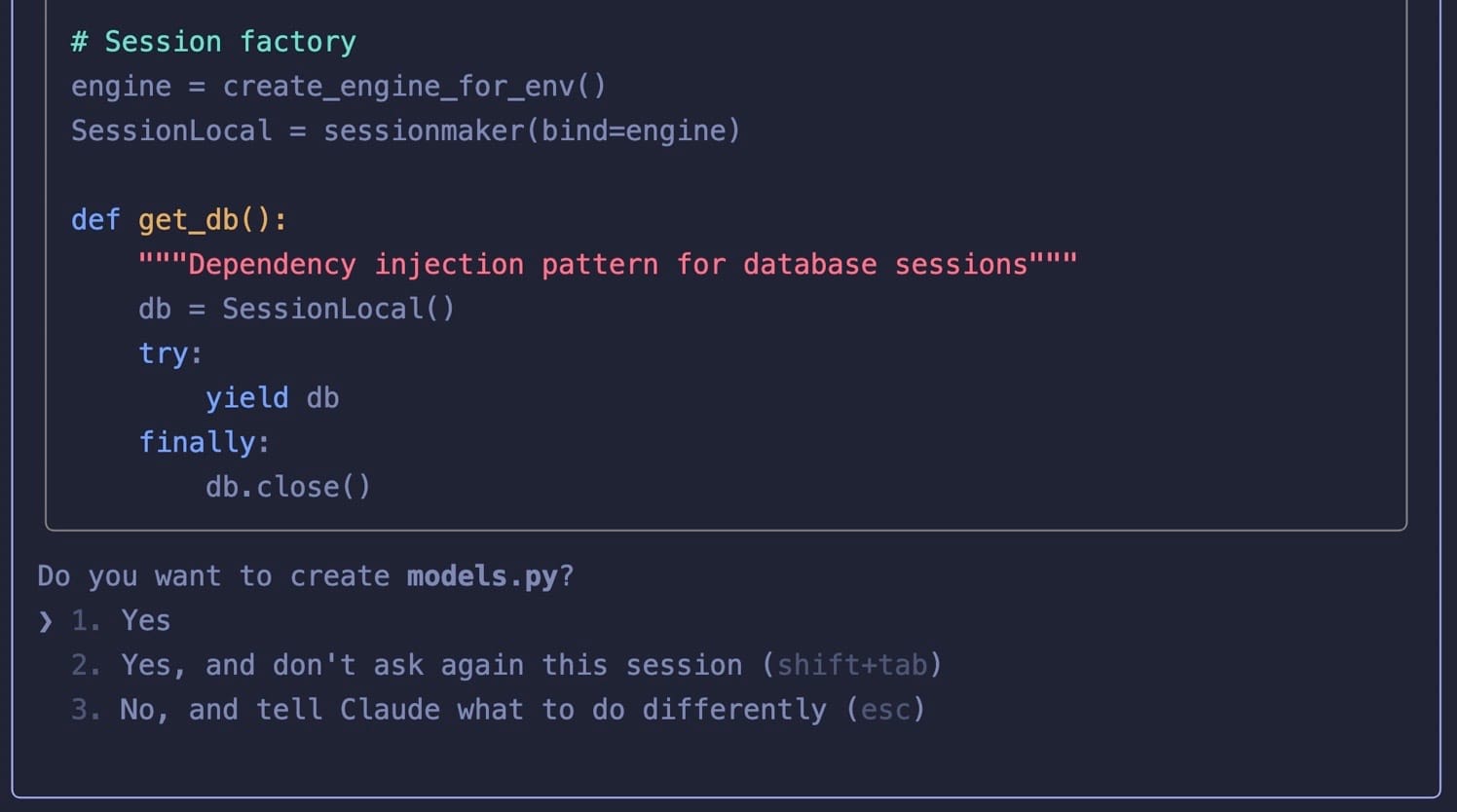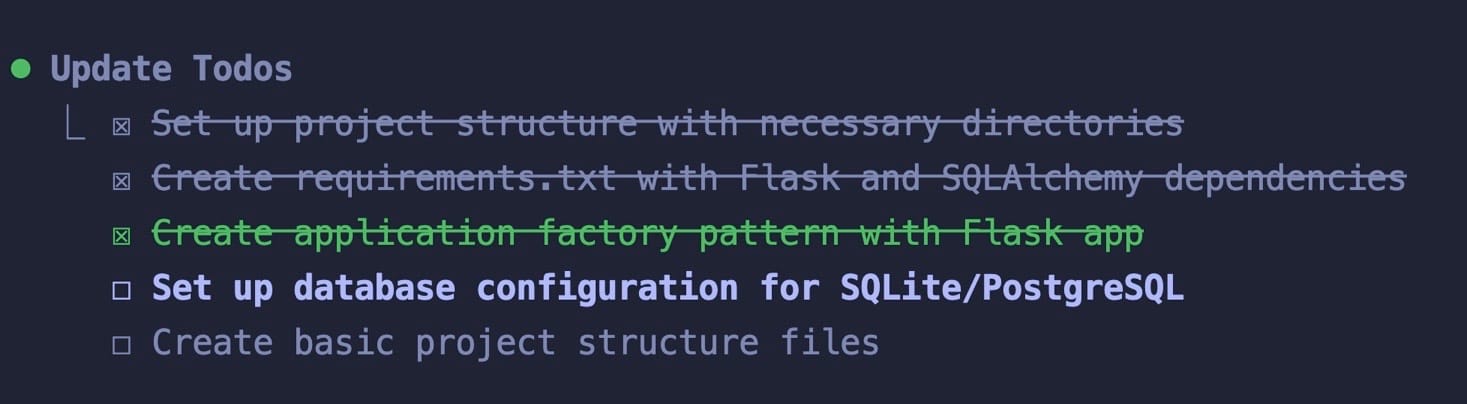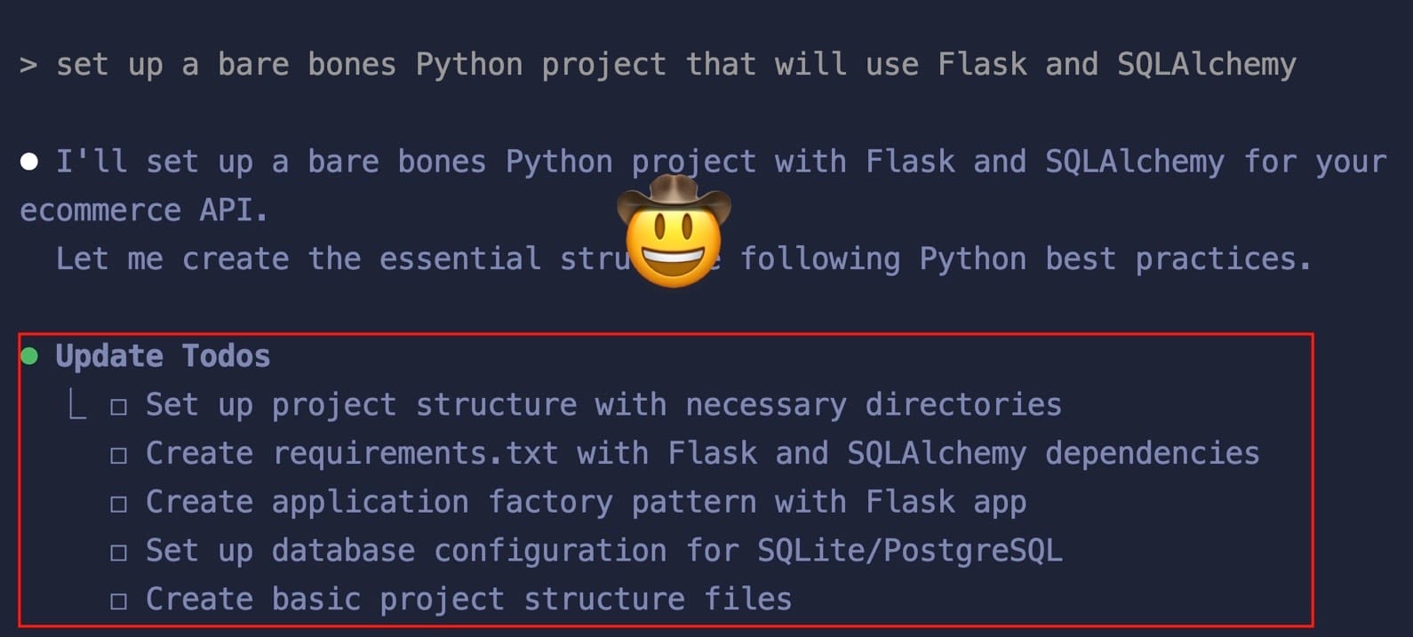 Speaking of, here's one last thing I absolutely love about Claude Code! You can go "Full YOLO" mode, if you want, and tell it what you want to do. Something like set up a bare bones Python project that will use Flask and SQLAlchemy: