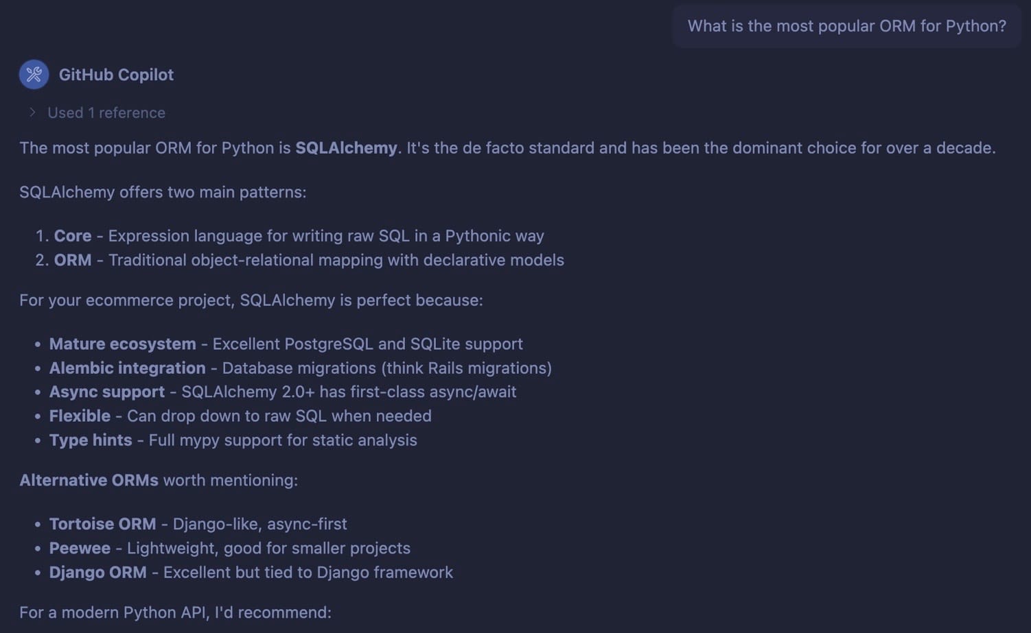 I'll start with the same prompt in "Ask" mode, using the same context instructions (.github/copilot-instructions.md): What is the most popular ORM for Python?