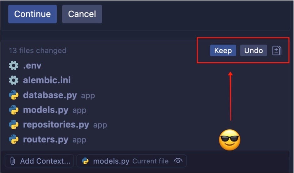 This works pretty well with code changes, but it won't delete files, which makes sense because how would it know if it created those files in the first place? There probably is a way to know, but... whatever, here's what happens when I hit "Undo":