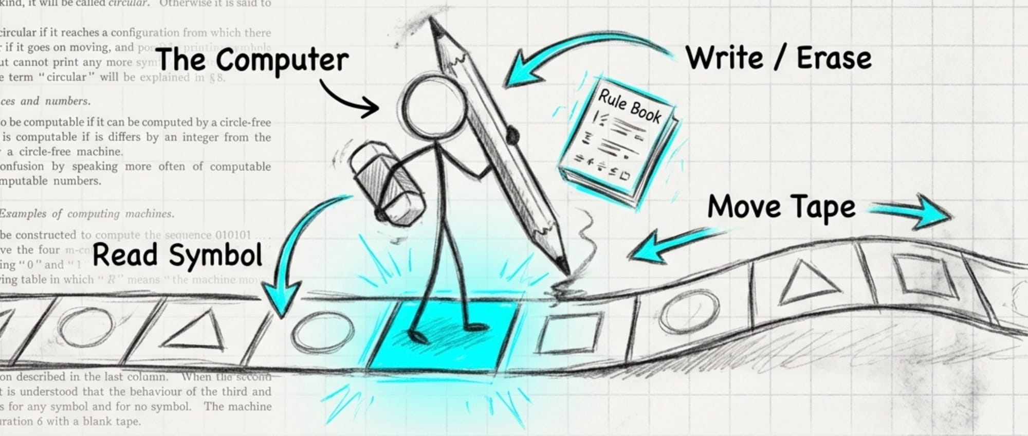 Back then, people with pencils and slide rules were called "computers" (watch Hidden Figures for more on this. Great movie), and Turing was wondering if it was possible to create a symbolic machine that could do the same thing.