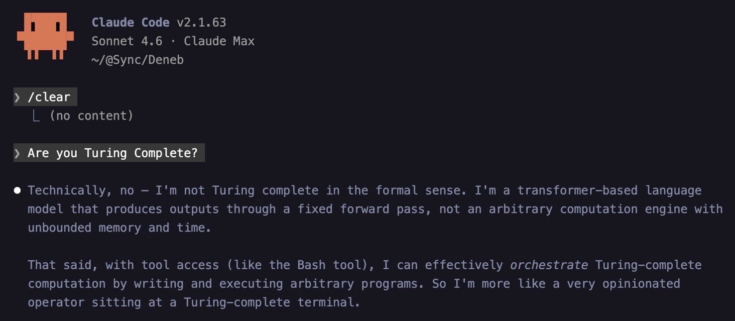 Hmmm. Is it? Or is it a very clever tape recorder? Either way, together Claude and I make up a fantastic Turing Machine. Claude is, essentially, the "brain":