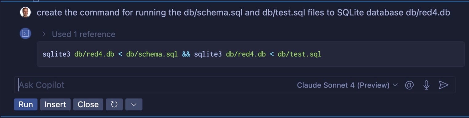 ('CLO-004', 'Invisible Socks', 1299, 'So comfortable you will forget you are wearing them (Warning: Actually invisible)', 'clothing', NULL, '2024-01-18 14:45:00', '2024-01-18 14:45:00')At that point you can step into the terminal and, once again, ask Copilot to generate the command for you to create a SQLite database with the schema and test data (use CMD or CTRL-I):