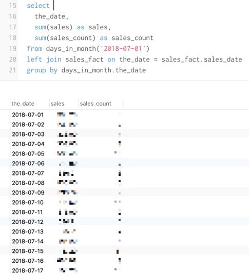 I want to join those numbers to my date series so I can have every day represented in my chart, not just a fat blue blob. To do that, I can use a simple left join: