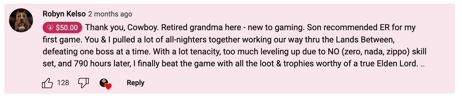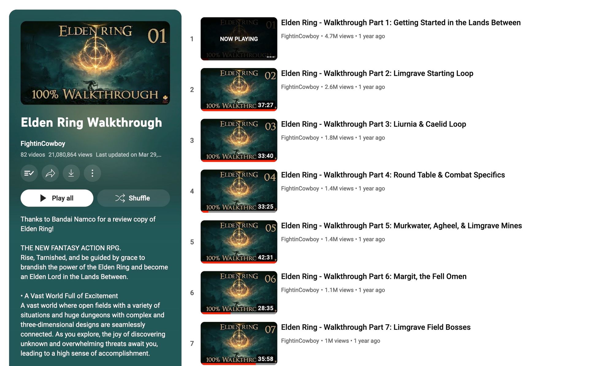 This guy, "FightinCowboy" (I don't know his real name) created an absolute masterpiece with his 82-video walkthrough of Elden Ring. Each video is 30-ish minutes, keeps a brisk pace, and his narration is pretty damned solid.
