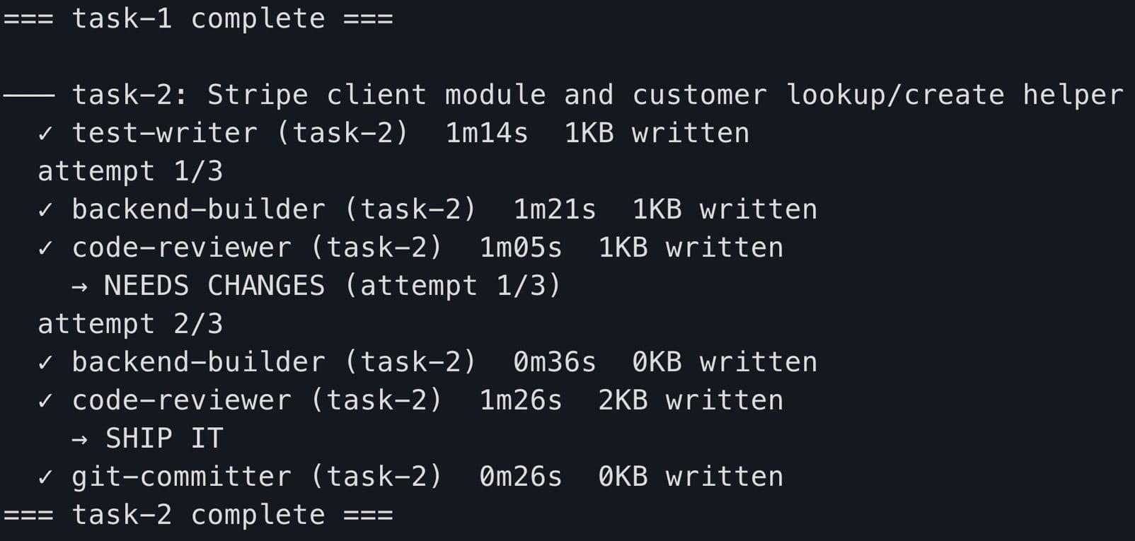 code-reviewerthen goes off and does its thing, completely independent in terms of context. It only knows about the PRD, the tests, and the code for the task. If it doesn't like what it sees, it kicks off the build loop again. - If the