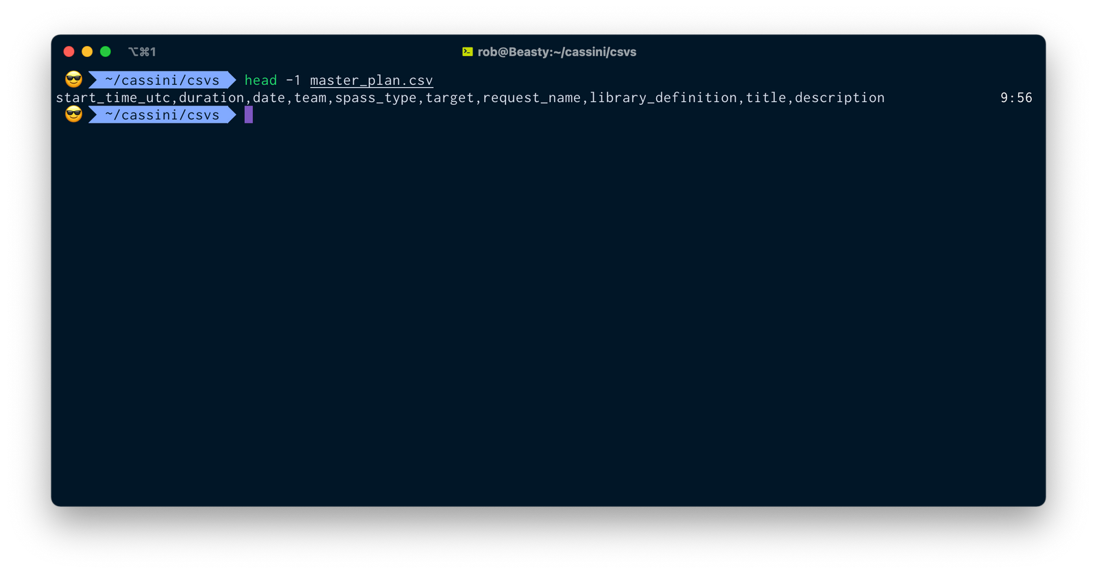 This will pop out the very first line of the CSV, which is typically the header row. I’m working with Cassini’s mission plan data, so this is what I see:
