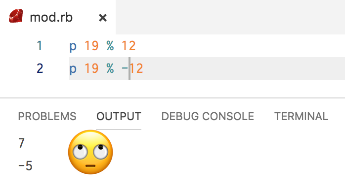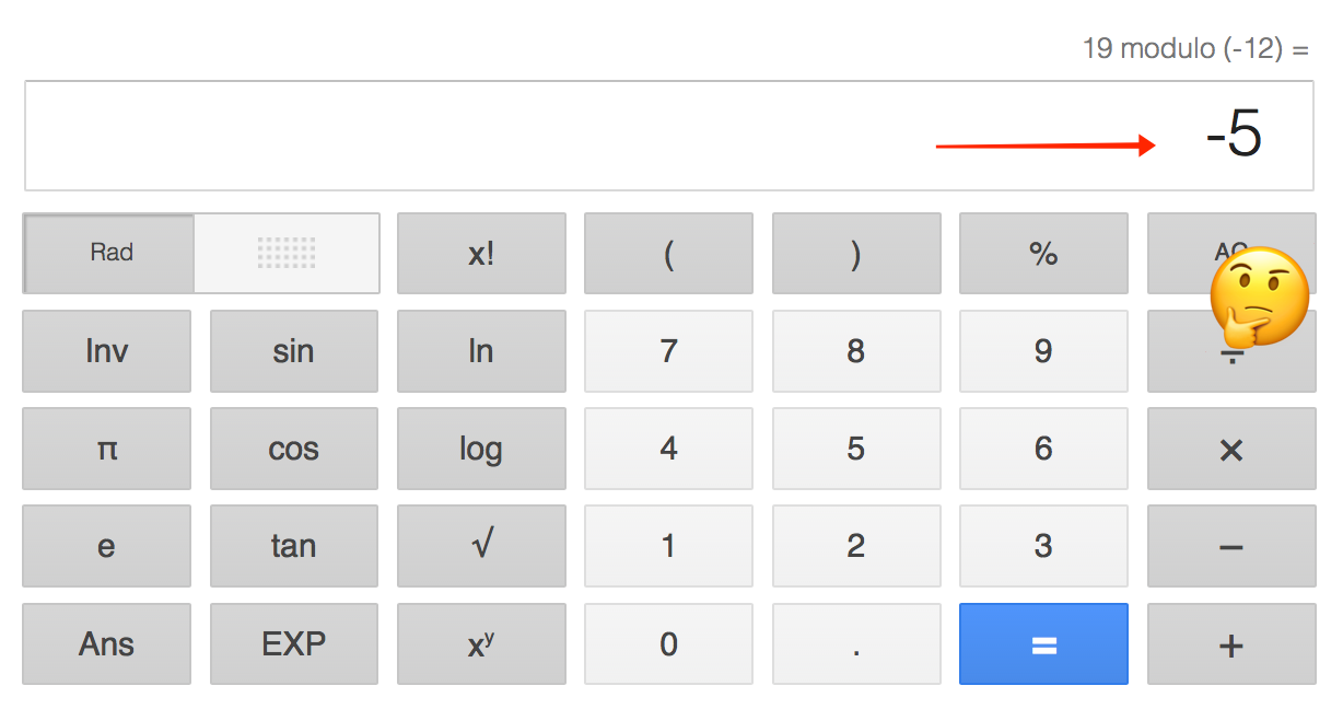 The answer to this problem is understanding the difference between a remainder and a modulo. Programmers conflate these operations and they should not, as they only act the same when the divisor (in our case 12) is positive. You can easily send bugs into production if your divisor is negative.